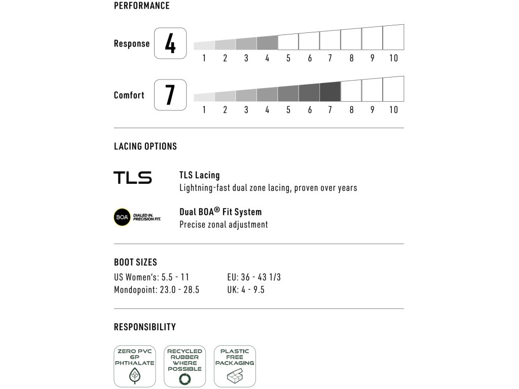 Bota Scala je tu pro holky, co se chtějí posunout z pozice snowboardové začátečnice a rychle dohnat všechny pokročilé expertky. Tahle bota je perfektně namixovanou směsí komfortu, opory a ochrany, aby ses mohla bezbolestně zdokonalovat s každým obloučkem. Nově vybavená kvalitní nízkoprofilovou podrážkou z gumy pro jistý grip a pohodlnou tepelně tvarovatelnou vnitřní vložkou Women’s Cloud 3, co zahřeje tvoje nohy nehledě na předpověď počasí. Anatomicky tvarovatelná dámská varianta stélky podrží klenbu a Interlock Systém zase patu. Kombinace spolehlivého šněrování BOA® Fit s Re/Lace zámkem utahování vložky tě dostane na svah v rekordním čase, takže v progresu ti už opravdu nestojí nic v cestě. PODRÁŽKA Z ODOLNÉ PŘÍRODNÍ GUMY * UTAHOVACÍ SYSTÉM BOA® Fit * DÁMSKÁ VNITŘNÍ TEPELNĚ UPGRADE !! TVAROVATELNÁ BOTIČKA (VLOŽKA) CLOUD 3 LINER * INTERLOCK SYSTÉM PRO USAZENÍ VLOŽKY DO BOTY * DLS UTAHOVÁNÍ BOTIČKY, RE/LACE ZÁMEK UTAHOVÁNÍ BOTIČKY * DÁMSKÁ ANATOMICKY TVAROVANÁ STÉLKA * TVRDOST: 4.